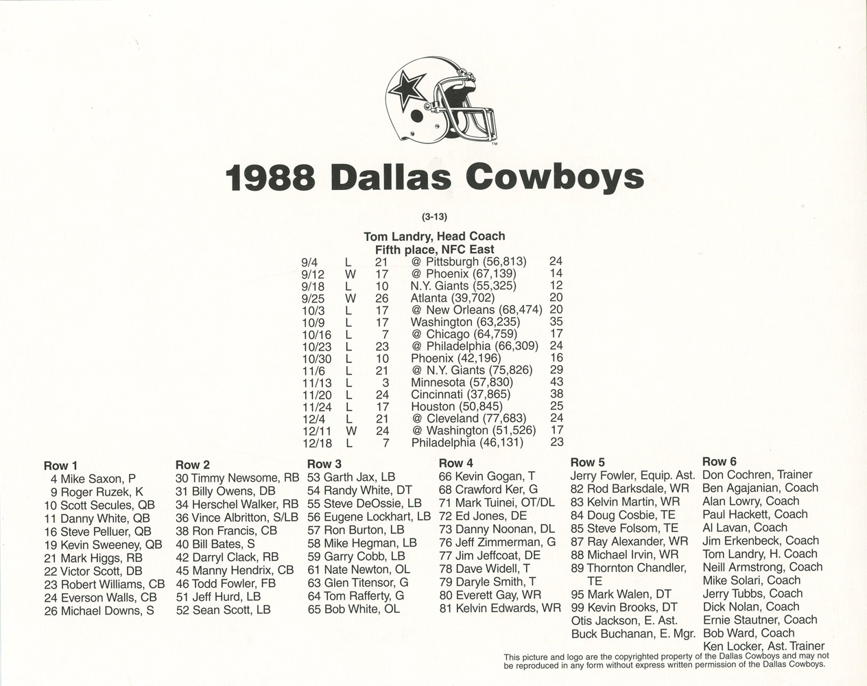 Teams dallas cowboys 1988 roster recap the 1988 dallas cowboys, coached by tom landry , missed the playoffs after finishing the.