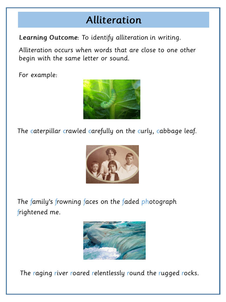 Alliteration occurs when several words in a row (or close together) start with the same consonant sound. Alliteration is a poetic technique in which the beginning sound is repeated in words for effect. Writers use alliteration to make stories and poems fun to read. Tongue tongue twisters often use alliteration to. After a few of these alliteration worksheets, your students.