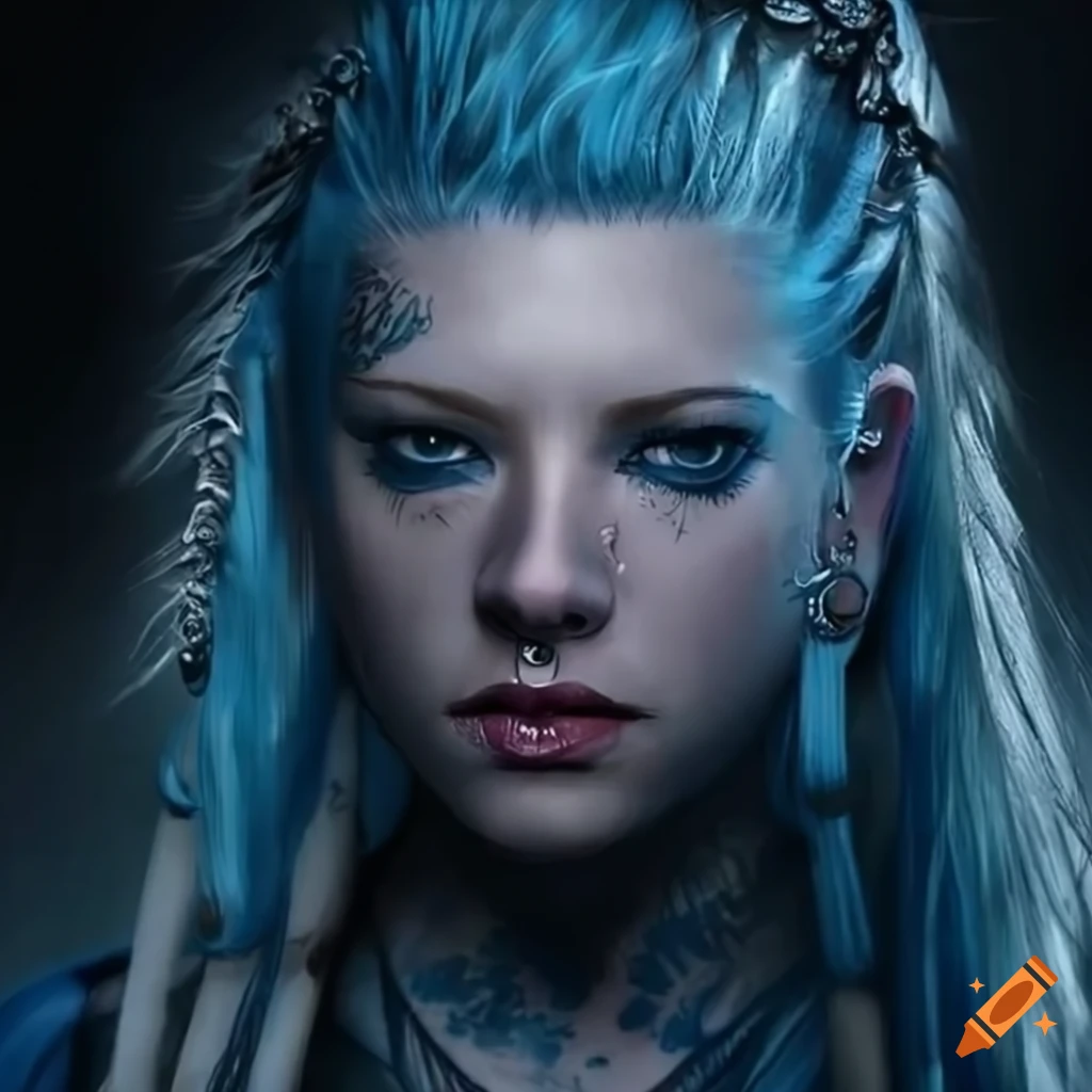 Fierce, blue haired lagertha with piercings, tattoos and striking eyes