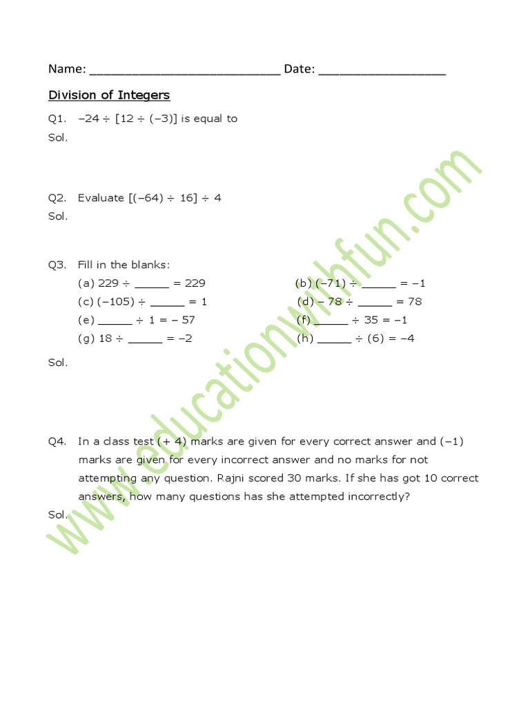 This exercise sheet on integers has. The numbers may be selected to be. In worksheet on division of integers, the questions are based on dividing integers. This integers worksheet may be configured for either single or multiple digit horizontal division problems. Below are six versions of our grade 6 math worksheet on division of integers;