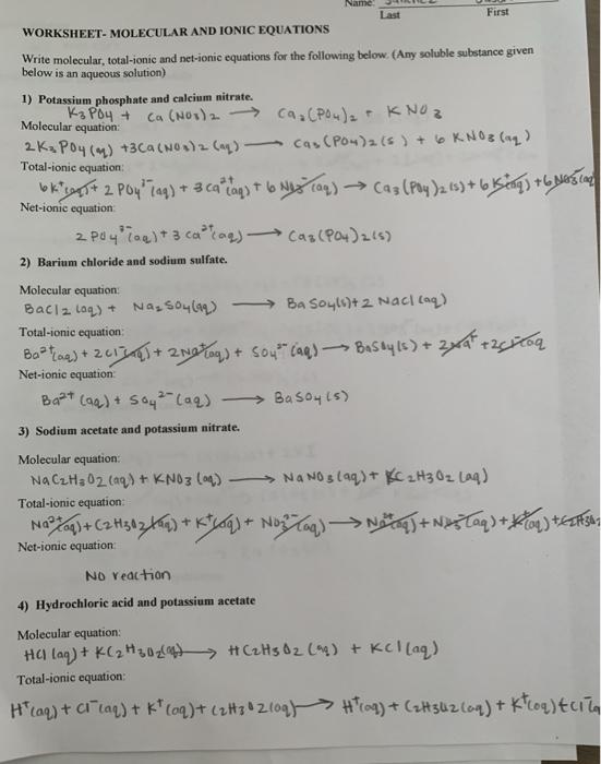 Molecular Complete And Net Ionic Equations Worksheet With Answers