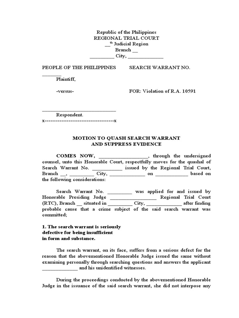 Motion To Quash Warrant Form - File the original motion with the clerk of superior court and ask to have the 3 copies stamped. The district attorney’s office may file a motion to quash bench warrant for you. If the district attorney files the motion, you will not have to. Find free forms for civil justice court cases in nevada, including a motion to quash bench warrant. These are called “conformed copies” and serve. Filing a motion to quash requires specific documents to support the claim challenging the warrant’s validity. Download forms in word, pdf, or.
