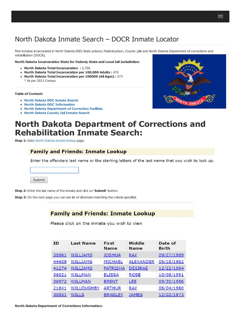 The north dakota inmate search is an online database maintained by the north dakota department of corrections and rehabilitation. North dakota department of corrections and rehabilitation The north dakota corrections and rehabilitation office has a “resident lookup” feature on their website,. Records of inmates serving their sentence in nd state prisons are maintained by north dakota department of corrections and..