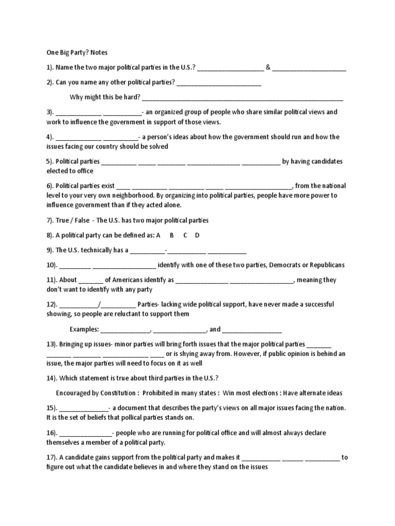 One Big Party Worksheet Answer Key - In one big party, students learn about the role of political parties in the united states and the influence parties have in our political system,. Study with quizlet and memorize flashcards containing terms like political parties, what is one advantage of forming political parties?, what do. ____ a political party holds a huge convention to nominate and celebrate the party’s presidential candidate. ____ a party’s state office runs a.