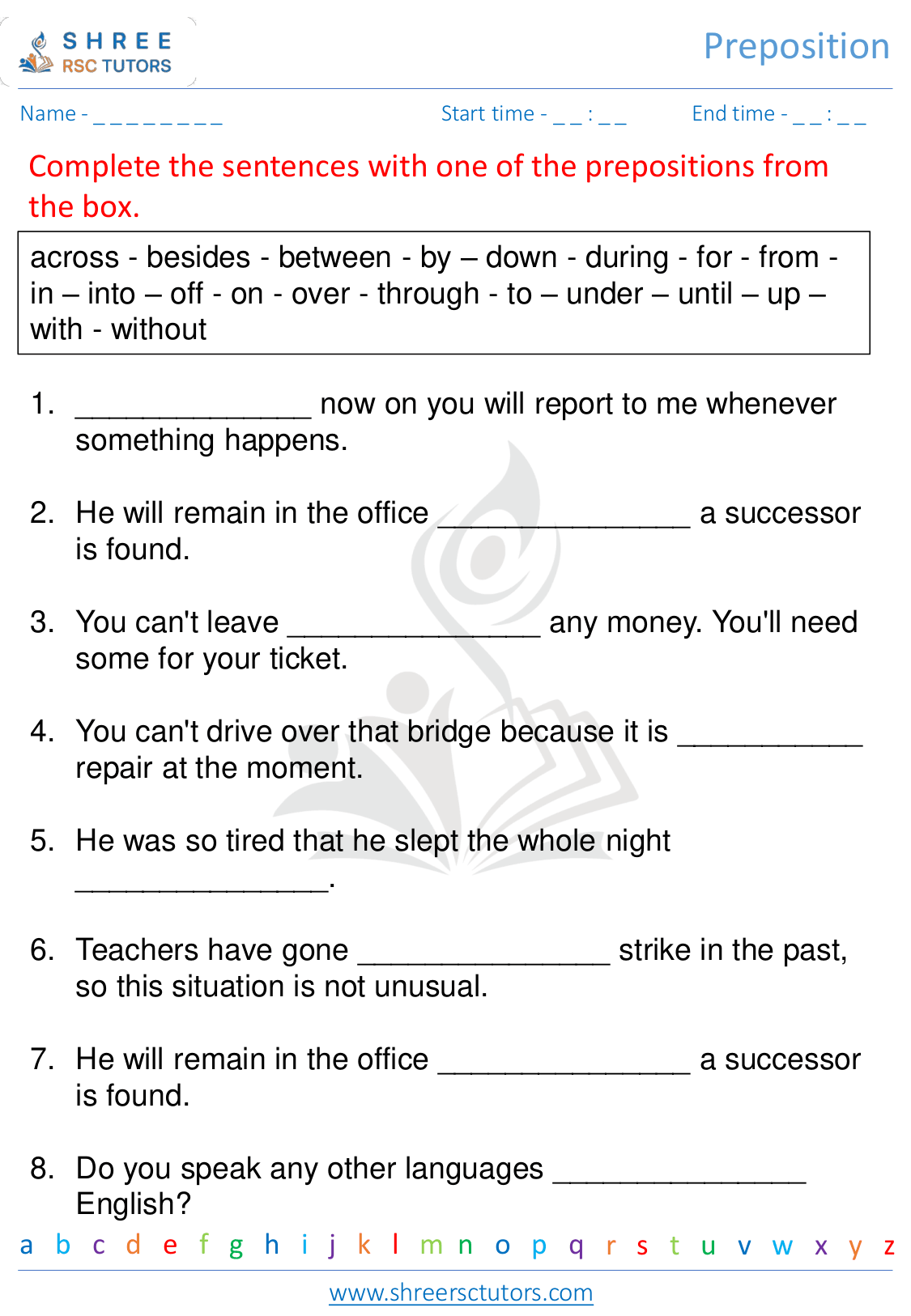 Preposition worksheets for Grade 5 English shree rsc tutors
