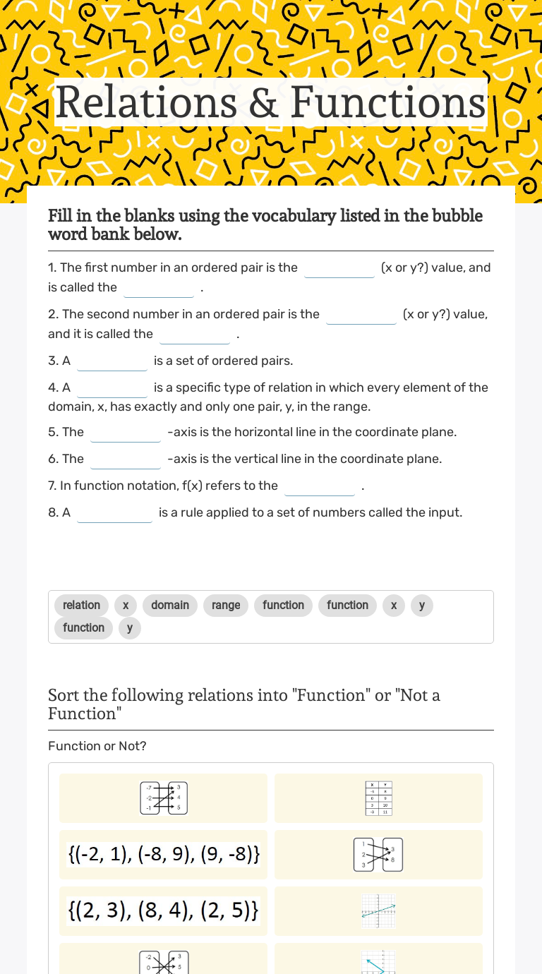Relations & Functions Interactive Worksheet by Michelle Walsh Wizer.me
