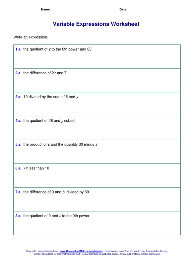 Choose from various topics such as. Generate and print worksheets for writing expressions with variables in different levels and formats. Write each as a verbal expression. Students define variables and write expressions to answer questions with unknown amounts.