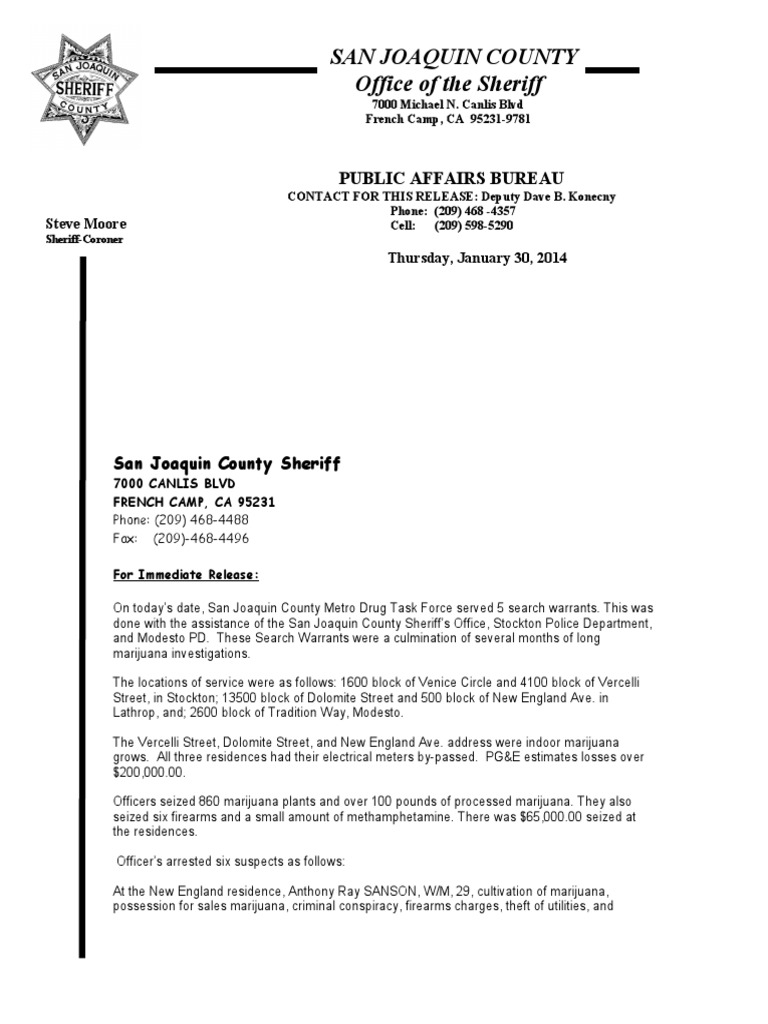 San Joaquin County Metro Narcotics Task Force Serves 5 Search Warrants