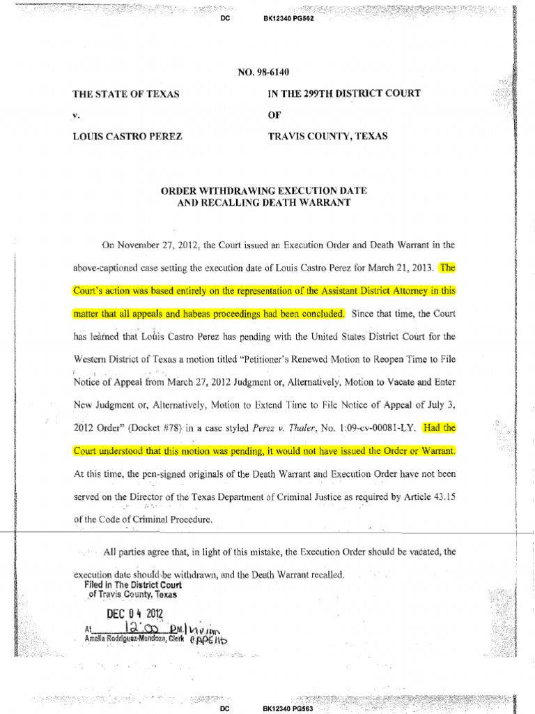 ORDER WITHDRAWING EXECUTION DATEAND RECALLING DEATH WARRANT Cm/Ecf